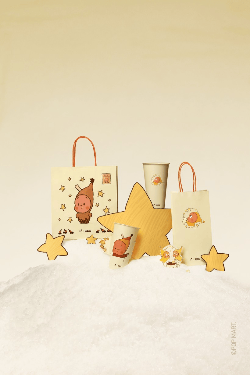 首次全球同步联名活动正式上线日,喜茶与泡泡玛特旗下人气IP星星人的联名活动正式上线,本次联名既是星星人IP在茶饮领域的首秀,也是泡泡玛特与喜茶的首度联合。星星人IP创作者大欣以本次联名为灵感进行全新创作,星星人复刻了喜茶 logo 阿喜 45° 喝茶的经典姿态,还身着融入黑糖啵啵元素的服饰,围上节日红围巾。伴随产品上新,喜茶同时推出了基于全新星星人形象设计的,包括饮品杯、纸袋、杯套在内的全线联名限定包材,以及灵感小卡、贴纸、徽章、茶碗等限定周边。联名杯套上还藏有设计小彩蛋,转动杯套时,可以为杯子上的星星人戴上围巾。